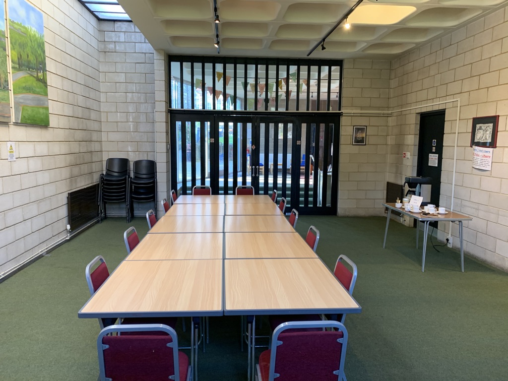 We offer the main hall for hire which can accommodate a maximum of 120 people *. The room can be set out in a variety of ways depending on your needs, and can be set up with tables or a free space for activities. There is a raised stage at one end of the hall, with a hatch and door into the kitchen area.